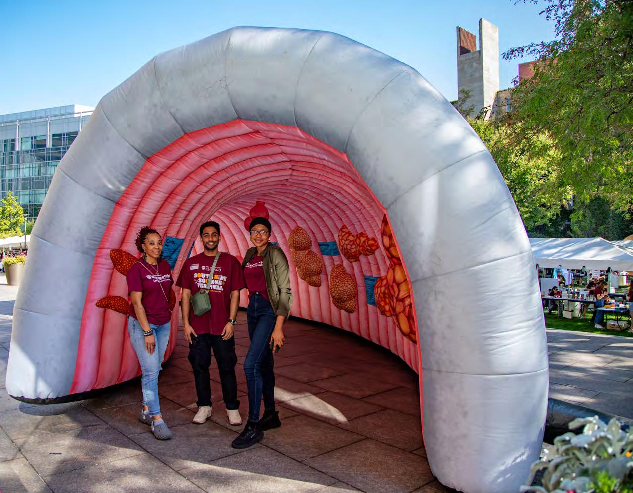 On October 4, the University of Chicago welcomed over 4,000 guests for the annual South Side Science Festival. There, UCCCC faculty, staff, and trainees hosted the popular “Cancer Corner,” which featured activities across the cancer research continuum. The main attraction was "Coco the Colon," an inflatable, walk-through colon to teach about gastro-intestinal diseases and encourage cancer screening. Other highlights included a "glow dough" sunscreen and UV demonstration, LEGO DNA mutation modeling, pipette watercolor painting, and pedal-powered smoothie blenders to promote a fiber-rich diet for colon health.
