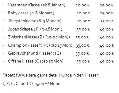 Änderungen und/oder Ergänzungen in der bestehenden Deckrüden- bzw. Züchterliste sind ausschließlich jeweils zu Beginn eines neuen Kalenderjahres kostenfrei. Bei Änderungen und/oder Ergänzungen des bestehenden Eintrages im laufenden Jahr wird ein Unkostenbeitrag in Höhe von 5,00 € fällig.