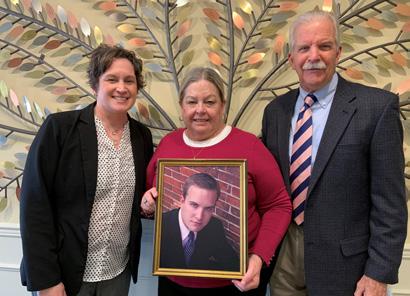 L to R: Erica Joseph, Community Foundation President, with Althea Groton and Judge Thomas Groton who hold a photo of their son Tyler Groton.