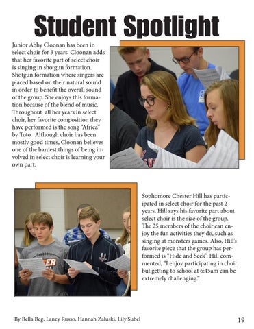 Sophomore Chester Hill has participated in select choir for the past 2 years. Hill says his favorite part about select choir is the size of the group. The 25 members of the choir can enjoy the fun activities they do, such as singing at monsters games. Also, Hill’s favorite piece that the group has performed is “Hide and Seek”. Hill commented, “I enjoy participating in choir but getting to school at 6:45am can be extremely challenging.”