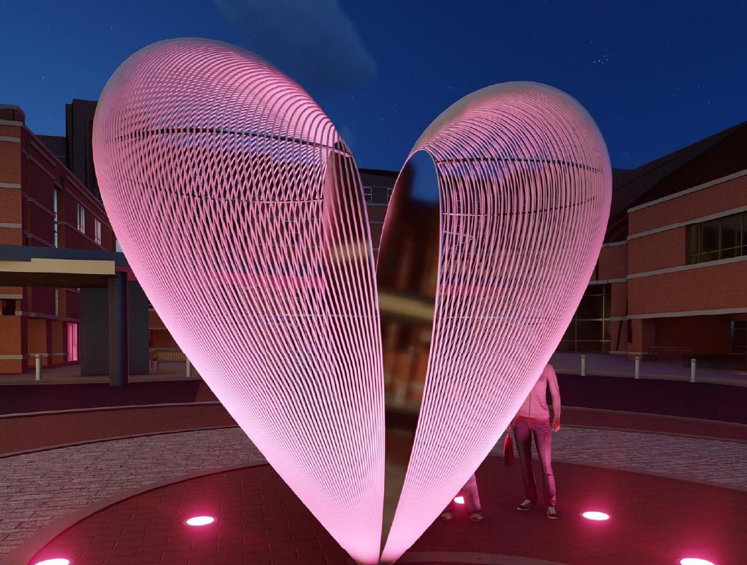 “Corous, like the physiological sections of a heart, is also a vessel. We peer into its open form and can read our own image on the mirror of its surface. Corous will be 12 feet tall and occupy a new plaza I have designed in the center of the roundabout entry to the Hospital.”