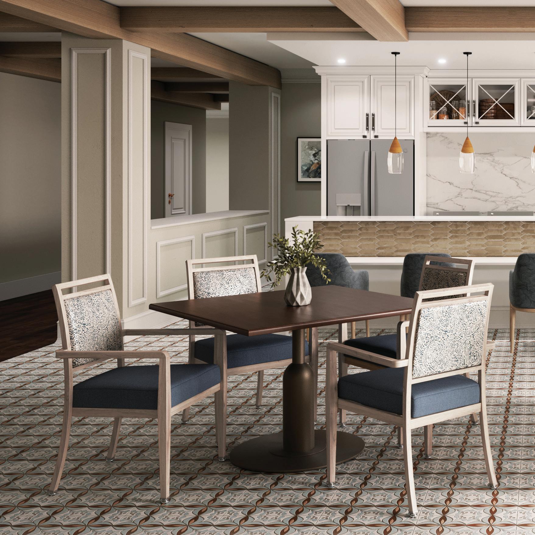 Table surfaces in senior living facilities should be made from durable materials that can withstand wear and tear. Wood is a popular choice as it supports biophillic initiatives. Solid surface or Thermofoil tables are a great option, as they are easy to clean and maintain.