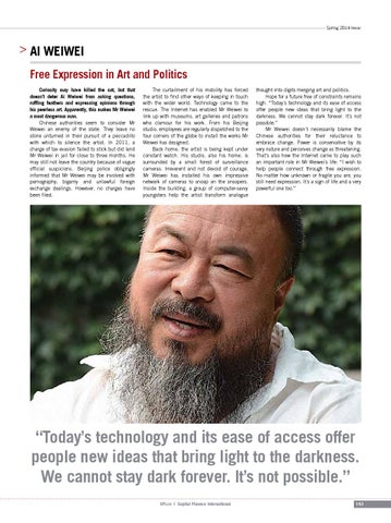thought into digits merging art and politics. Hope for a future free of constraints remains high. “Today’s technology and its ease of access offer people new ideas that bring light to the darkness. We cannot stay dark forever. It’s not possible.” Mr Weiwei doesn’t necessarily blame the Chinese authorities for their reluctance to embrace change. Power is conservative by its very nature and perceives change as threatening. That’s also how the Internet came to play such an important role in Mr Weiwei’s life: “I wish to help people connect through free expression. No matter how unknown or fragile you are, you still need expression. It’s a sign of life and a very powerful one too.”