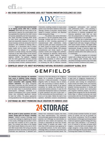 management participation and positively raise performance levels. Thus providing a crucial solution that promotes participation and efficiency in corporate management and reducing operational costs that can stem from the postponement of meetings when the quorum of participants is not complete. ADX also has a mobile-based digital wallet that enables the sending and receiving of digital funds with ease, through a linking of ADX issued investor number. This digital wallet empowers users to manage their stock exchange requirements through a real-time digital payout model, where investors receive their cash dividends instantly within their wallet as soon as it is distributed. Noting the navigation of a turbulent market with a steady hand and quick wit, the CFI.co judging panel declares Abu Dhabi Securities Exchange as winner of the 2020 Best Trading Innovation Excellence (GCC) award.