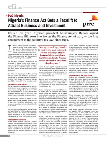 or 7.5 percent (where the recipient is resident in a country that has a Double Tax Agreement with Nigeria) in the hands of the shareholders / investors. The Act now provides that no additional tax is imposed on dividends that exceed total profits in any of these circumstances. That is, companies distributing excess dividends from retained earnings which had been taxed in prior years, exempt income and franked investment income would no longer suffer Excess Dividend Tax. The result of the amendment is that, from a tax perspective, Nigeria becomes a more attractive destination for holding company structures. INCENTIVES FOR THE REAL ESTATE SECTOR Nigeria has a relatively youthful population of about 200 million people — and a housing deficit estimated at 20 million units. Only 100,000 housing units are developed each year. The major challenges to the real estate sector are difficulties in registering properties and obtaining construction permits, which in turn create obstacles to securitisation of property. It also increased the cost of investing in the sector. These challenges are responsible for the significant amount of “dead” capital in the sector which — estimated to be in the region of $900bn. The luxury real estate market is estimated to hold between $230bn to $750bn in value, while the middle market carries between $60bn and $170bn in value. Real estate investment companies (REICs), are arguably liable to corporate income tax at 30 percent of their profits and a further two percent Tertiary Education Tax (TET). In addition, distributions to shareholders could be liable to WHT at 10 percent. This is a deviation from the treatment of real estate investment trusts (REITs) globally as tax-neutral vehicles. The reason for the difference in practice is lack of specific provisions in the current tax laws. Under the old law, the tax treatment of an REIC made it unattractive to investors (although in practice, the FIRS sometimes did not strictly apply the law).