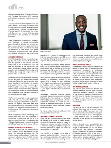 Digital economy significant economic presence Generally, a non-resident company is only subject to tax in Nigeria if it has a fixed base (FB) in Nigeria and only the profits attributable to the fixed base would be taxable in Nigeria. Prior to the Act, a non-resident company would create a FB in Nigeria if it had a physical presence in Nigeria. Non-resident companies providing services remotely to Nigerian consumers were not subject to Nigerian tax. However, they were subject to WHT of 10 percent or 7.5 percent (where the non-resident is resident of a country that has a Double Tax Agreement with Nigeria) on passive income (dividends, interest, rents and royalties) earned from Nigeria. To address modern business realities, the Act proposes certain amendments. TAXATION OF E-COMMERCE ACTIVITIES Under the Act, a non-resident company would be deemed to be taxable in Nigeria where it transmits, emits signals, sounds, or images by electronic or wireless means in respect of any e-commerce activity, provided it has a significant economic presence in Nigeria and profits are attributable to such activities. The intention is to broaden the tax base by capturing profits arising from e-commerce that have previously escaped tax. It is expected that all non-resident companies earning income CFI.co | Capital Finance International