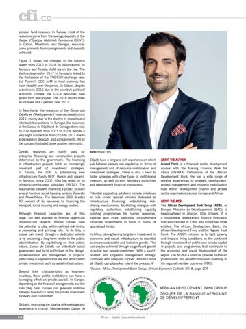 pension fund reserves. In Tunisia, most of the resources come from the savings deposits of the Caisse d'Épargne Nationale Tunisienne (CENT). In Gabon, Mauritania and Senegal, resources come primarily from consignments and deposits collected. Figure 1 shows the changes in the balance sheets from 2015 to 2018 (in billion euros). In Morocco and Tunisia, AuM are on the rise. The decline observed in 2017 in Tunisia is linked to the fluctuation of the TND/EUR exchange rate, but Tunisia’s CDC AuM in local currency has risen steadily over the period. In Gabon, despite a decline in 2016 due to the country's political/ economic climate, the CDC’s resources have grown from year-to-year. The 2018 results show an increase of 47 percent over 2017. In Mauritania, the resources of the Caisse des Dépôts et Développement have decreased since 2015, mainly due to the decline in deposits and interbank transactions. In Senegal, the resources of the Caisse de Dépôts et de Consignations rose by 20,63 percent from 2015 to 2018, despite a very slight contraction from 2016 to 2017 due to a decrease in deposits and consignments. All of the caisses illustrated show positive net results. Overall, resources are mainly used for enterprise financing and construction projects determined by the government. The financing of infrastructure projects holds an increasingly important part of investment strategies. In Tunisia, the CDC is establishing new infrastructure funds (AIIF, Hanon and Arkam). In Morocco, since 2002, CDG has relied on its infrastructure-focused subsidiary (MEDZ). The Mauritanian caisse is financing a project to build several hundred social housing units in Zouerate and Nouadhibou. The Gabonese CDC devotes 40 percent of its resources to financing the transport, social housing and energy sectors. Although financial capacities are, at this stage, not well adapted to finance large-scale infrastructure projects, African caisses have the potential to play, within defined risk limits, a pioneering and priming role. To do this, a caisse can invest through a dedicated vehicle or by becoming a long-term lender to the public administration. By capitalising on their public nature, Caisse de Dépôts can potentially assist government and local authorities in the design, implementation and management of projects, particularly in segments that are less attractive to private investment such as social infrastructure.