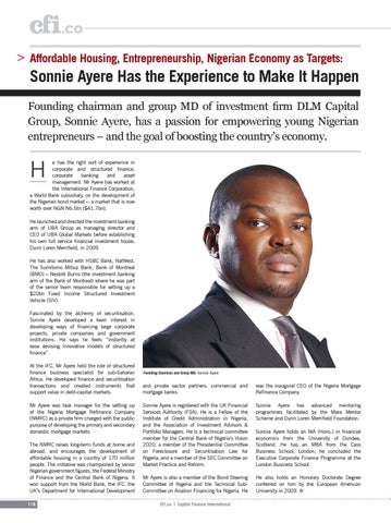 e has the right sort of experience in corporate and structured finance, corporate banking and asset management. Mr Ayere has worked at the International Finance Corporation, a World Bank subsidiary, on the development of the Nigerian bond market – a market that is now worth over NGN N6.5tn ($41.7bn). He launched and directed the investment banking arm of UBA Group as managing director and CEO of UBA Global Markets before establishing his own full service financial investment house, Dunn Loren Merrifield, in 2009. He has also worked with HSBC Bank, NatWest, The Sumitomo Mitsui Bank, Bank of Montreal (BMO) – Nesbitt Burns (the investment banking arm of the Bank of Montreal) where he was part of the senior team responsible for setting up a $20bn Fixed Income Structured Investment Vehicle (SIV). Fascinated by the alchemy of securitisation, Sonnie Ayere developed a keen interest in developing ways of financing large corporate projects, private companies and government institutions. He says he feels “instantly at ease devising innovative models of structured finance”. At the IFC, Mr Ayere held the role of structured finance business specialist for sub-Saharan Africa. He developed finance and securitisation transactions and created instruments that support value in debt-capital markets. Mr Ayere was task manager for the setting up of the Nigeria Mortgage Refinance Company (NMRC) as a private firm charged with the public purpose of developing the primary and secondary domestic mortgage markets. The NMRC raises long-term funds at home and abroad, and encourages the development of affordable housing in a country of 170 million people. The initiative was championed by senior Nigerian government figures, the Federal Ministry of Finance and the Central Bank of Nigeria. It won support from the World Bank, the IFC, the UK’s Department for International Development 118
