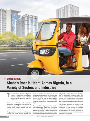 process of selection and nurturing as the core of the organisation’s success over the past three decades. Its largest partner is the TVS Motor Company, part of the $8bn TVS Group, for whom Simba handles importation, local assembly, marketing, distribution and after sales service in Nigeria. The company’s TVS King motorised tricycle is the clear market leader in Nigeria, with a commanding market share. TVS’ three-wheeler vehicle, a relatively new entrant in a category which has long provided vital last-mile travel solutions to people across the world, has enjoyed tremendous success CFI.co | Capital Finance International