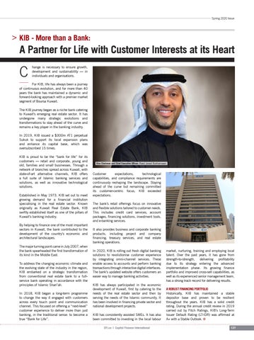 For KIB, life has always been a journey of continuous evolution, and for more than 40 years the bank has maintained a dynamic and forward-looking approach with a premier market segment of Boursa Kuwait. The KIB journey began as a niche bank catering to Kuwait’s emerging real estate sector. It has undergone many strategic evolutions and transformations to stay ahead of the curve and remains a key player in the banking industry. In 2019, KIB issued a $300m AT1 perpetual Sukuk to support its local expansion plans and enhance its capital base, which was oversubscribed 15 times. KIB is proud to be the “bank for life” for its customers — retail and corporate, young and old, families and small businesses. Through a network of branches spread across Kuwait, with state-of-art alternative channels, KIB offers a full suite of Islamic banking services and solutions, as well as innovative technological solutions. Established in May 1973, KIB set out to meet growing demand for a financial institution specialising in the real estate sector. Known originally as Kuwait Real Estate Bank, KIB swiftly established itself as one of the pillars of Kuwait’s banking industry. By helping to finance one of the most important sectors in Kuwait, the bank contributed to the development of the country’s economic and architectural landscapes. The major turning point came in July 2007, when the bank spearheaded the first transformation of its kind in the Middle East. To address the changing economic climate and the evolving state of the industry in the region, KIB embarked on a strategic transformation from conventional real estate bank to a fullservice bank operating in accordance with the principles of Islamic Shari’ah. In 2018, KIB began a long-term programme to change the way it engaged with customers across every touch point and communication channel. This focused on offering a “next-level” customer experience to deliver more than just banking, in the traditional sense: to become a true “Bank for Life”.