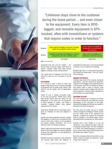 equipment they sell, and the market — but are less keen to provide longer credit terms to clients. Linklease neatly pulls these strands together, creating a unique market position. The “secret sauce” of leasing in the UAE is not difficult to work out, but in practice it can be tricky. DUE DILIGENCE It is crucial to have a blend of client due diligence approaches and an in-depth knowledge of equipment and its resale value, where in the world it can be resold, and its depreciation profile. Assets fit onto a sliding commodity scale, at one end very generic (forklift truck, office laser printer) where value and useful life are established. At the other end, the equipment is either bespoke or custom, and resale is uncertain. Leasing prefers more generic equipment for this reason. Asset value, blended with its commodity nature, gives an indication of what due diligence is needed. Generic low-value equipment requires a lighter due diligence in order to turn an equipment sale around. Some basic criteria can be pre-agreed and offered through distributors. This is an attractive option for leasing companies. Generic high-value equipment requires a greater depth of client due diligence to ensure capability to service the instalments. It is also attractive to leasing companies Bespoke low-value equipment is less attractive and requires deep asset due diligence to CFI.co | Capital Finance International