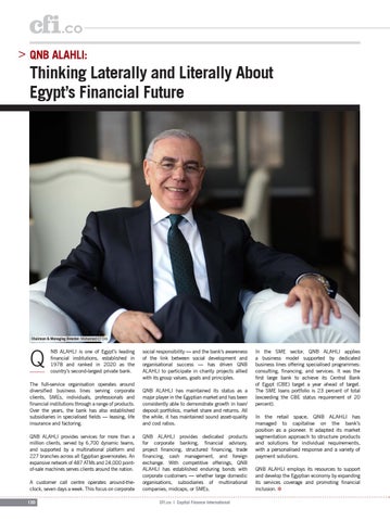 social responsibility — and the bank’s awareness of the link between social development and organisational success — has driven QNB ALAHLI to participate in charity projects allied with its group values, goals and principles. QNB ALAHLI has maintained its status as a major player in the Egyptian market and has been consistently able to demonstrate growth in loan/ deposit portfolios, market share and returns. All the while, it has maintained sound asset-quality and cost ratios. QNB ALAHLI provides dedicated products for corporate banking, financial advisory, project financing, structured financing, trade financing, cash management, and foreign exchange. With competitive offerings, QNB ALAHLI has established enduring bonds with corporate customers — whether large domestic organisations, subsidiaries of multinational companies, midcaps, or SMEs. CFI.co | Capital Finance International