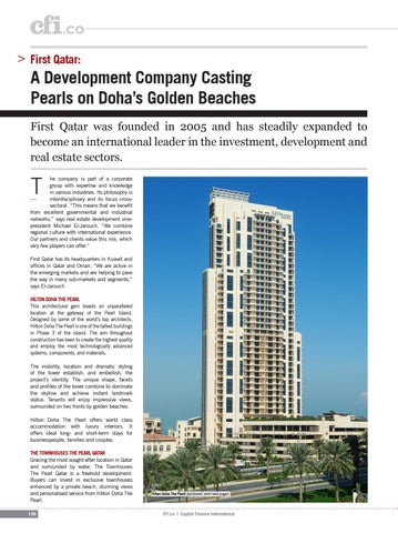 he company is part of a corporate group with expertise and knowledge in various industries. Its philosophy is interdisciplinary and its focus crosssectoral. “This means that we benefit from excellent governmental and industrial networks,” says real estate development vicepresident Michael El-Jarouch. “We combine regional culture with international experience. Our partners and clients value this mix, which very few players can offer.” First Qatar has its headquarters in Kuwait and offices in Qatar and Oman. “We are active in the emerging markets and are helping to pave the way in many sub-markets and segments,” says El-Jarouch. HILTON DOHA THE PEARL This architectural gem boasts an unparalleled location at the gateway of the Pearl Island. Designed by some of the world’s top architects, Hilton Doha The Pearl is one of the tallest buildings in Phase 3 of the island. The aim throughout construction has been to create the highest quality and employ the most technologically advanced systems, components, and materials. The visibility, location and dramatic styling of the tower establish, and embellish, the project’s identity. The unique shape, facets and profiles of the tower combine to dominate the skyline and achieve instant landmark status. Tenants will enjoy impressive views, surrounded on two fronts by golden beaches. Hilton Doha The Pearl offers world class accommodation with luxury interiors. It offers ideal long- and short-term stays for businesspeople, families and couples. THE TOWNHOUSES THE PEARL QATAR Gracing the most sought-after location in Qatar and surrounded by water, The Townhouses The Pearl Qatar is a freehold development. Buyers can invest in exclusive townhouses enhanced by a private beach, stunning views and personalised service from Hilton Doha The Pearl. 136