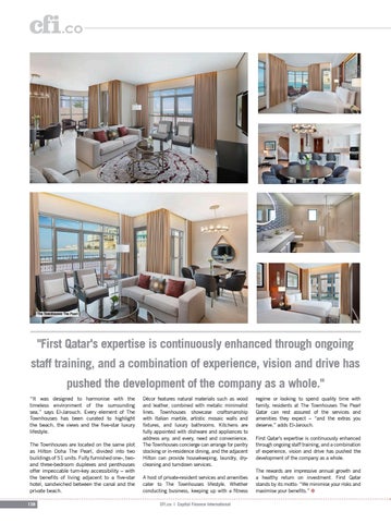 "First Qatar's expertise is continuously enhanced through ongoing staff training, and a combination of experience, vision and drive has pushed the development of the company as a whole." “It was designed to harmonise with the timeless environment of the surrounding sea,” says El-Jarouch. Every element of The Townhouses has been curated to highlight the beach, the views and the five-star luxury lifestyle. The Townhouses are located on the same plot as Hilton Doha The Pearl, divided into two buildings of 51 units. Fully furnished one-, twoand three-bedroom duplexes and penthouses offer impeccable turn-key accessibility – with the benefits of living adjacent to a five-star hotel, sandwiched between the canal and the private beach. 138