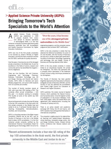 "Over the years, it has become one of the strongest private universities in the Middle East." engineering programs, and the computer science programme also achieved ABET certification. ASPU is the only university in Jordan that has obtained the National Accreditation for seven of it's nine faculties, with the Faculty of Pharmacy the only one in Jordan to obtain gold certification. Faculties of Information Technology, Engineering and technology, Arts and Design, Faculty of Business and Nursing obtained silver status. ASPU is the only private university in Jordan linked to an educational hospital, the private Ibn AlHaytham. The ASPU has partnered with a company which specialises in the treatment of brain tumours using a technique pioneered at Ibn Al-Haytham. The Faculty of Business has been granted Eligibility Approval by the Association to Advance Collegiate Schools of Business (AACSB), and the Faculty of Law has obtained the accreditation from Hcéres (High Council for Evaluation of Research and Higher Education). ASPU publishes The Jordan Journal of Applied Science, which publishes the Natural Science and Humanities series. It has the highest number of publications on the Scopus database –more than 1000 papers. ASPU has several MOUs and agreements with establishments including the University of Sydney and UCL. There is an active student and academics exchange with Turkey, the UK and Cyprus, and ASPU students have distinguished themselves in international competition. The university is rightly proud of its state-of-theart teaching and research-based laboratories, virtual pharmacy, renewable energy centre, Arts and Design Exhibition Centre, Student Activity Centre, conference hall, Olympic stadium and mosque. i