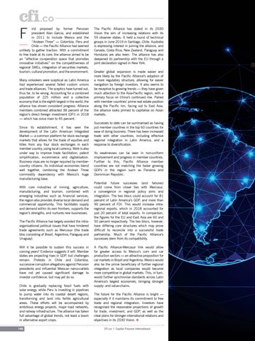 irst proposed by former Peruvian president Alan Garcia, and established in 2011 to include Mexico and the “Andean Three” — Colombia, Peru and Chile — the Pacific Alliance had seemed unlikely to gather traction. With a commitment to free trade at its core, the alliance aimed to be an “effective co-operation space that promotes innovative initiatives” on the competitiveness of regional SMEs, integration of securities markets, tourism, cultural promotion, and the environment. Many onlookers were sceptical as Latin America had experienced several failed custom unions and trade alliances. The sceptics have turned out, thus far, to be wrong. Accounting for a combined population of 225 million and a collective economy that is the eighth largest in the world, the alliance has shown consistent progress. Alliance members combined attracted 38 percent of the region’s direct foreign investment (DFI) in 2018 — which has since risen to 45 percent. Since its establishment, it has seen the development of the Latin American Integrated Market — a common platform for stock exchange markets that allows for the trade of equities and titles from any four stock exchanges in each member country, using local currency. Work is also under way to improve trade facilitation, patent simplification, e-commerce and digitalisation. Business visas are no longer required by membercountry citizens. Its individual economies blend well together, combining the Andean Three commodity dependency with Mexico’s huge manufacturing base. With core industries of mining, agriculture, manufacturing, and tourism, combined with emerging industries such as financial services, the region also provides diverse local demand and commercial opportunity. This facilitates supply and demand within its own frontiers, supports the region’s strengths, and nurtures new businesses. The Pacific Alliance has largely avoided the intraorganisational political issues that have hindered trade agreements such as Mercosur (the trade bloc consisting of Brazil, Argentina, Paraguay and Uruguay). Will it be possible to sustain this success in coming years? Evidence suggests it will. Member states are projecting rises in GDP, but challenges remain. Protests in Chile and Colombia, successive corruption allegations against Peruvian presidents and influential Mexican narco-cartels have not yet caused significant damage to investor confidence, but may yet do so. Chile is gradually replacing fossil fuels with solar energy, while Peru is investing in pipelines to pump water into its coastal desert regions, transforming arid land into fertile agricultural areas. These efforts will be accompanied by ambitious energy projects, major road networks, and railway infrastructure. The alliance has taken full advantage of global trends, not least a boom in alternative export crops.