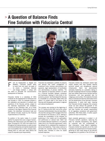 Fiduciaria Central has developed several high impact projects that have boosted national economic growth and strengthened national infrastructure. Marín has demonstrated exemplary leadership as a president, taking on the task of applying financial inclusion strategies that have helped lower-income families become homeowners, and have generated jobs for indigenous communities. The residents of remote areas of Colombia are both the native labour force and the beneficiaries of the fiduciary’s business developments. It works both ways, meaning that Fiduciaria Central recognises the company would not exist without the goodwill of the people. It cares about the welfare of employees and their families and accepts responsibility for all regulatory compliance with government authorities. With these pillars, it builds support systems for local communities. Good corporate governance is evident in all Fiduciaria Central’s operations, balancing the need for corporate transparency and respect for customers with the confidentiality of their information. Under Marín’s leadership, Fiduciaria Central has reached one of the most important accomplishments for finantial entities, garnering an AAA credit rating for the efficient management of its portfolio in the 2019 term. i 147