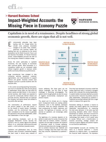 human wellbeing. But these gains are not without challenges, and the scale of those challenges is becoming unmanageable. The systems which brought growth are also the cause of negative environmental, employment and product impacts. The planet and its climate are at a tipping point. Employment trends are creating welfare dispersions. Even in the wealthier, developed economies, there are massive disparities that have consequences for health, happiness, and security. The legitimacy of business, and the promise of capitalism, are increasingly called into question. The legitimacy of a business depends on its ability to create value for society. Companies that create value for investors, workers, customers, suppliers and the larger ecosystem are evidence of businesses’ power to increase wellbeing. Directors and executives who manage companies aim to combine resources (raw materials and labour) in strategic ways that create more value than they consume, represented by quadrants I and II. CFI.co | Capital Finance International