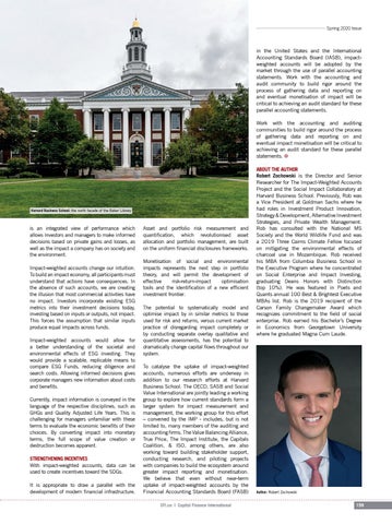 Asset and portfolio risk measurement and quantification, which revolutionised asset allocation and portfolio management, are built on the uniform financial disclosures frameworks. Monetisation of social and environmental impacts represents the next step in portfolio theory, and will permit the development of effective risk-return-impact optimisation tools and the identification of a new efficient investment frontier. The potential to systematically model and optimise impact by in similar metrics to those used for risk and returns, versus current market practice of disregarding impact completely or by conducting separate overlay qualitative and quantitative assessments, has the potential to dramatically change capital flows throughout our system. To catalyse the uptake of impact-weighted accounts, numerous efforts are underway in addition to our research efforts at Harvard Business School. The OECD, SASB and Social Value International are jointly leading a working group to explore how current standards form a larger system for impact measurement and management, the working group for this effort – convened by the IMP - includes, but is not limited to, many members of the auditing and accounting firms. The Value Balancing Alliance, True Price, The Impact Institute, the Capitals Coalition, & ISO, among others, are also working toward building stakeholder support, conducting research, and piloting projects with companies to build the ecosystem around greater impact reporting and monetisation. We believe that even without near-term uptake of impact-weighted accounts by the Financial Accounting Standards Board (FASB) CFI.co | Capital Finance International