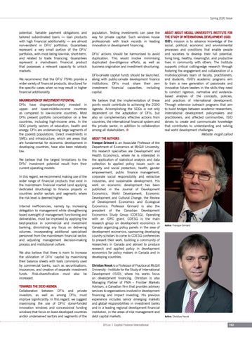 population. Testing investments can pave the way for private capital. Such windows house professionals with track records in leading innovation in development financing. DFIs’ actions should be harmonised to avoid duplication. This would involve minimising duplicated due-diligence efforts, as well as business origination and investment structuring. DFIs-private capital funds should be launched, along with public-private development finance institutions. DFIs must share their own investment financial capacities, including capital. We believe that the implementation of these points would contribute to achieving the 2030 Agenda. Accomplishing the SDGs is not only dependent on the adaptation of DFIs, but also on complementary effective actions from countries, the international financial system and the private sector, in addition to collaboration among all stakeholders. i ABOUT THE AUTHORS Franque Grimard is an Associate Professor of the Department of Economics at McGill University. His research specialties are Development and Health Economics, where he is interested in the application of statistical analysis and data collection to applied policy issues such as poverty and social protection, health, gender empowerment, public finance management, corporate social responsibility and extractive industries, and sustainable development. His work on economic development has been published in the Journal of Development Economics, World Development, Economic Development and Cultural Change, the Review of Development Economics and Ecological Economics. Professor Grimard is also the president of the Canadian Development Economics Study Group (CDESG). Operating with an IDRC grant, CDESG is the main research group on development economics in Canada organizing policy panels in the area of development economics, sponsoring developing country scholars to come to CDESG conferences to present their work, building a community of researchers in Canada and abroad to produce research and applied policy in development economics for policy makers in Canada and in developing countries. Christian Novak is a Professor of Practice at McGill University - Institute for the Study of International Development (ISID), where his works focus on development financing. Christian is also Managing Partner of FMA - Frontier Markets Advisors, a Canadian firm that provides advisory services to organizations involved in development financing and impact investing. His previous experience includes senior emerging markets and global responsibilities in investment banks and in a leading regional development financial institution, in the areas of risk management and debt capital markets. CFI.co | Capital Finance International