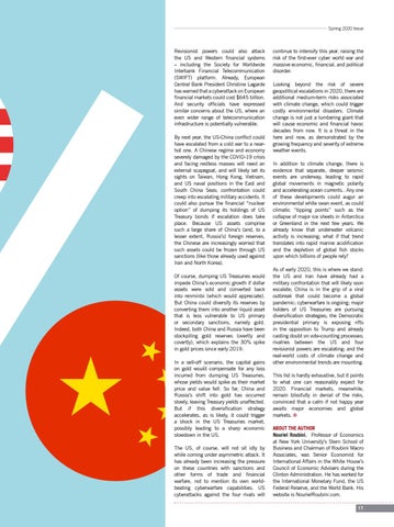 continue to intensify this year, raising the risk of the first-ever cyber world war and massive economic, financial, and political disorder. Looking beyond the risk of severe geopolitical escalations in 2020, there are additional medium-term risks associated with climate change, which could trigger costly environmental disasters. Climate change is not just a lumbering giant that will cause economic and financial havoc decades from now. It is a threat in the here and now, as demonstrated by the growing frequency and severity of extreme weather events. In addition to climate change, there is evidence that separate, deeper seismic events are underway, leading to rapid global movements in magnetic polarity and accelerating ocean currents.. Any one of these developments could augur an environmental white swan event, as could climatic “tipping points” such as the collapse of major ice sheets in Antarctica or Greenland in the next few years. We already know that underwater volcanic activity is increasing; what if that trend translates into rapid marine acidification and the depletion of global fish stocks upon which billions of people rely? As of early 2020, this is where we stand: the US and Iran have already had a military confrontation that will likely soon escalate; China is in the grip of a viral outbreak that could become a global pandemic; cyberwarfare is ongoing; major holders of US Treasuries are pursuing diversification strategies; the Democratic presidential primary is exposing rifts in the opposition to Trump and already casting doubt on vote-counting processes; rivalries between the US and four revisionist powers are escalating; and the real-world costs of climate change and other environmental trends are mounting. This list is hardly exhaustive, but it points to what one can reasonably expect for 2020. Financial markets, meanwhile, remain blissfully in denial of the risks, convinced that a calm if not happy year awaits major economies and global markets. i ABOUT THE AUTHOR Nouriel Roubini, Professor of Economics at New York University's Stern School of Business and Chairman of Roubini Macro Associates, was Senior Economist for International Affairs in the White House’s Council of Economic Advisers during the Clinton Administration. He has worked for the International Monetary Fund, the US Federal Reserve, and the World Bank. His website is NourielRoubini.com. 17