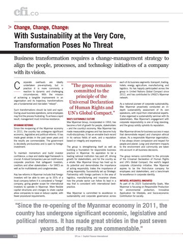 "The group remains committed to the principle of the Universal Declaration of Human Rights and UN’s Global Compact." MAX’S SUSTAINABLE CULTURE Max Myanmar Group, incorporated in 1993, has become a font of growth for people, stakeholders – and the country’s economy. Max Myanmar has made measurable progress and has become truly multi-disciplinary. It has an enviable track record in its various fields of work, and a reputation based on integrity and experience. The group is strengthening itself as well as building a foundation for responsible business practice in Myanmar. Its aspiration to be a leading national institution has paid off, driving growth for stakeholders, and for the country as a whole. Max Myanmar Group has lived up to its potential and demonstrates the importance of acting responsibly. trates the importance of acting responsibly. Successfully set up Strategic Partnership with foreign partners in the area of logistics, manufacturing and insurance shows how the private sector can follow its lead in a way that is consistent with international bestpractice. Max Myanmar is committed to excellence in sustainability and corporate governance across