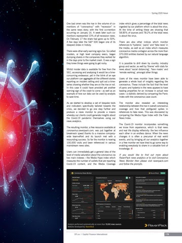 One bad omen was the rise in the volume of comentions of “coronavirus” with “recession” in the same news story; with the first co-mention occurring on January 16. A week later such comentions represented 10% of all recession news. On February 17 the share had gone up to 50%. A few days later the S&P 500 began one of its steepest slides in history. There were other early warning signs too. So called insiders, or high level company execs, began dumping shares in the companies they worked for in the days prior to the market crash. It was a sign they knew things were going to get rocky. Whilst insider data is available for free from the SEC, accessing and analysing it would be a timeconsuming endeavour, yet in the blink of an eye our platform can aggregate all the different stories reporting on insiders selling and spit out a timeseries showing whether they are on the rise or not. In this case it could have provided yet another warning sign of the crash to come - as well as an example of how our data can be used by analysts to save time. As we started to develop a set of bespoke tools and indicators specifically tailored towards the crisis, we decided to go one step further and produce a news monitor to provide a means whereby our clients could generate insights about the Covid-19 pandemic themselves using our news analytics. The resulting monitor, a free resource available at coronavirus.ravenpack.com, was put together at breakneck speed thanks to a massive companywide team-effort and its launch met with a resounding success. So far the monitor is nearing 100,000 visits and been referenced in various mainstream news sites. Users can immediately get a general idea of the level of media saturation about the coronavirus via two main indexes - the Media Hype index which measures the number of outlets that are reporting Covid-19 content, and the Media Coverage