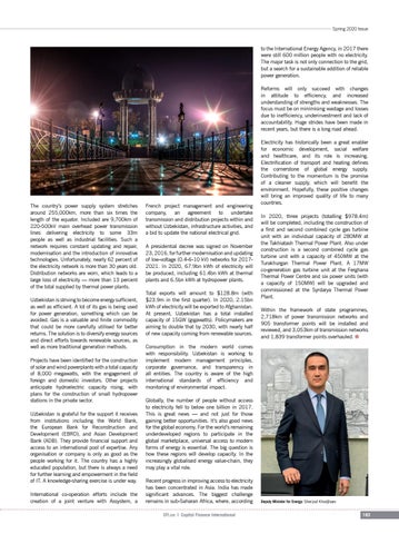 French project management and engineering company, an agreement to undertake transmission and distribution projects within and without Uzbekistan, infrastructure activities, and a bid to update the national electrical grid. A presidential decree was signed on November 23, 2016, for further modernisation and updating of low-voltage (0.4-6-10 kV) networks for 20172021. In 2020, 67.9bn kWh of electricity will be produced, including 61.4bn kWh at thermal plants and 6.5bn kWh at hydropower plants. Total exports will amount to $128.8m (with $23.9m in the first quarter). In 2020, 2.15bn kWh of electricity will be exported to Afghanistan. At present, Uzbekistan has a total installed capacity of 15GW (gigawatts). Policymakers are aiming to double that by 2030, with nearly half of new capacity coming from renewable sources.