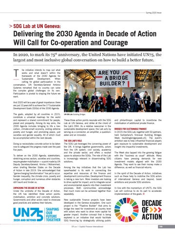 and philanthropic capital to incentivise the mobilisation of additional private finance. BRIDGES FOR SUSTAINABLE FINANCE In 2019, the SDG Lab, together with 50 partners, held Switzerland’s first-ever Building Bridges Week (buildingbridgesweek.ch). The event’s ambition was to help influential financial players gain exposure to sustainable development and insight into impactful investments. The Week also tapped into the growing fatigue with the “business as usual” attitude. Many citizens have pressing demands for new investment models aligned with the 2030 Agenda. They want to see their money make a difference, as well as financial returns. In the spirit of the Decade of Action, initiatives such as these help to mobilise the SDG actors of international Geneva and beyond, boost ambitions and provide SDG solutions. In line with the momentum of UN75, the SDG Lab will continue to do its part to accelerate implementation of the goals. i