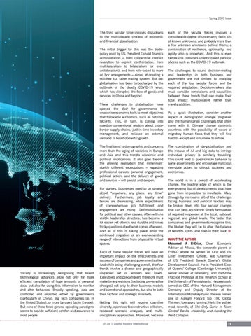 each of the secular forces involves a considerable degree of uncertainty (with lots of known unknowns, and probably more than a few unknown unknowns behind them), a combination of resilience, optionality, and agility also is important. And this is even before one considers unanticipated periodic shocks such as the COVID-19 outbreak. The challenges to sound decision-making and leadership in both business and government are not limited to mapping each of the four secular forces and the required adaptation. Decision-makers also must consider correlations and causalities between these trends that can make their total impact multiplicative rather than merely additive. As a quick illustration, consider another aspect of demographic change: migration and the humanitarian challenges that often come with it. Climate change confronts countries with the possibility of waves of migratory human flows that they will find hard to accept and inhumane to refuse. The combination of de-globalisation and the misuse of AI and big data to infringe individual privacy is similarly troubling. This could lead to questionable behavior by some governments and encourage malicious non-state actors to disrupt societies and economies. The world is in a period of accelerating change, the leading edge of which is the ever-growing list of developments that have gone from impossible to inevitable. Many (though by no means all) of the challenges facing business and political leaders may be broken down into four secular changes that can help anchor the timely formulation of required responses at the local, national, regional, and global levels. The faster that companies and governments recognise this, the likelier they will be to alter the balance of benefits, costs, and risks in their favor. i ABOUT THE AUTHOR Mohamed A El-Erian, Chief Economic Adviser at Allianz, the corporate parent of PIMCO where he served as CEO and coChief Investment Officer, was Chairman of US President Barack Obama’s Global Development Council. He is President Elect of Queens’ College (Cambridge University), senior adviser at Gramercy, and Part-time Practice Professor at the Wharton School at the University of Pennsylvania. He previously served as CEO of the Harvard Management Company and Deputy Director at the International Monetary Fund. He was named one of Foreign Policy’s Top 100 Global Thinkers four years running. He is the author, most recently, of The Only Game in Town: Central Banks, Instability, and Avoiding the Next Collapse. 19