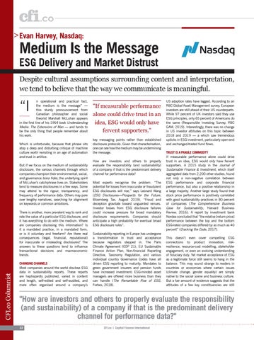 US adoption rates have lagged. According to an RBC Global Asset Management survey, European investors are still ahead of their US counterparts. While 97 percent of UK investors said they use ESG principles, only 65 percent of Americans do the same (Responsible Investing Survey, RBC GAM, 2019). Interestingly, there was no change in US investor attitudes on this topic between 2018 and 2019 — a which saw tremendous upticks in ESG investment, particularly open-end and exchanged-traded fund flows. TRUST IS A FRAGILE COMMODITY If measurable performance alone could drive trust in an idea, ESG would only have fervent supporters. A 2015 study in the Journal of Sustainable Finance & Investment, which itself aggregated data from 2,200 other studies, found not only a non-negative correlation between ESG performance and corporate financial performance, but also a positive relationship in a large majority. Another large study found that stock price performance is positively correlated with good sustainability practices in 80 percent of companies (The Comprehensive Business Case for Sustainability, Harvard Business Review, 2016). A report by investment bank Nordea concluded that “the relative [return price] performance between the top and the bottom ESG-rated companies differed by as much as 40 percent” (Cracking the Code, 2017). This doesn’t even cover compelling ESG connections to product innovation, riskresilience, resource-cost modelling, stakeholder engagement, or even an evolving understanding of fiduciary duty. Yet market acceptance of ESG as a legitimate force still seems to hang in the balance. This may sound strange to readers in countries or economies where certain issues (climate change, gender equality) are simply native to the social scene and business culture. But a fair amount of evidence suggests that the attitudes of a few key constituencies are still