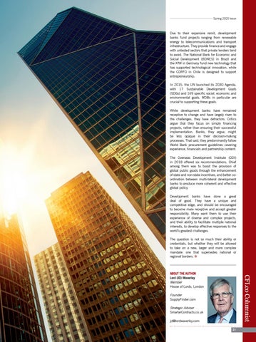 Due to their expansive remit, development banks fund projects ranging from renewable energy to telecommunications and transport infrastructure. They provide finance and engage with untested sectors that private lenders tend to avoid. The National Bank for Economic and Social Development (BDNES) in Brazil and the KfW in Germany fund new technology that has supported technological innovation, while the CORFO in Chile is designed to support entrepreneurship. In 2015, the UN launched its 2030 Agenda, with 17 Sustainable Development Goals (SDGs) and 169 specific social, economic and environmental goals. MDBs in particular are crucial to supporting these goals. While development banks have remained receptive to change and have largely risen to the challenges, they have detractors. Critics argue that they focus on simply financing projects, rather than ensuring their successful implementation. Banks, they argue, might be less opaque in their decision-making processes. That said, they predominantly follow World Bank procurement guidelines covering experience, financials and partnership content. The Overseas Development Institute (ODI) in 2018 offered six recommendations. Chief among them was to boost the provision of global public goods through the enhancement of state and non-state incentives, and better coordination between multi-lateral development banks to produce more coherent and effective global policy. Development banks have done a great deal of good. They have a unique and competitive edge, and should be encouraged to become more receptive and accept greater responsibility. Many want them to use their experience of diverse and complex projects, and their ability to facilitate multiple national interests, to develop effective responses to the world’s greatest challenges. The question is not so much their ability or credentials, but whether they will be allowed to take on a new, larger and more complex mandate: one that supersedes national or regional borders. i