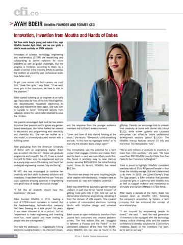 and the response from the younger audience members led to Bdeir’s eureka moment. “Lines and lines of kids started forming at the booth,” she recalls. “They would build something and ask, ‘Is this how my nightlight works?’ or ‘Is that why the elevator doors always open?’” She immediately saw the potential for a tech product that engages children and makes them want to learn — and was sure others would too. She found it relatively easy to raise start-up money, securing $850,000 in the initial funding round. Since its launch, littleBits has raised $62.3m. “The vision was always the same: inspiring people to be creative with electronics. Investors were as enamoured as I was with littleBits’ potential.” Bdeir was determined to create a gender-neutral product, in part due to her “secret mission” of getting more girls into STEM. She set out to democratise electronic engineering, elevating it from the domain of elite experts. She created a system of colour-coded electronic building blocks with intuitive design and universal appeal. Bdeir issues an open invitation to transform from passive tech consumers into creative problemsolvers. The first edition Bits are “snuggled in between a Picasso and the Post-it” in the permanent collection of the New York MoMA, where littleBits kits can also be found in the CFI.co | Capital Finance International