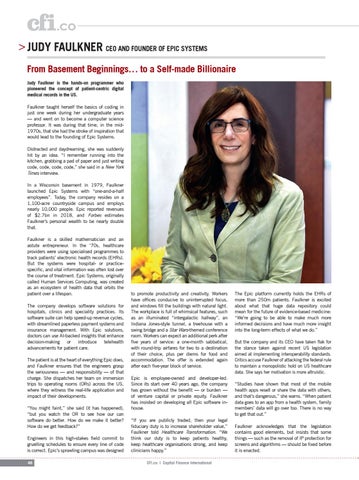 > JUDY FAULKNER CEO AND FOUNDER OF EPIC SYSTEMS From Basement Beginnings… to a Self-made Billionaire Judy Faulkner is the hands-on programmer who pioneered the concept of patient-centric digital medical records in the US. Faulkner taught herself the basics of coding in just one week during her undergraduate years — and went on to become a computer science professor. It was during that time, in the mid1970s, that she had the stroke of inspiration that would lead to the founding of Epic Systems. Distracted and daydreaming, she was suddenly hit by an idea. “I remember running into the kitchen, grabbing a pad of paper and just writing code, code, code, code,” she said in a New York Times interview. In a Wisconsin basement in 1979, Faulkner launched Epic Systems with “one-and-a-half employees”. Today, the company resides on a 1,100-acre countryside campus and employs nearly 10,000 people. Epic reported revenues of $2.7bn in 2018, and Forbes estimates Faulkner’s personal wealth to be nearly double that. Faulkner is a skilled mathematician and an astute entrepreneur. In the ‘70s, healthcare providers were using specialised programmes to track patients’ electronic health records (EHRs). But the systems were hospital- or practicespecific, and vital information was often lost over the course of treatment. Epic Systems, originally called Human Services Computing, was created as an ecosystem of health data that orbits the patient over a lifespan. The company develops software solutions for hospitals, clinics and speciality practices. Its software suite can help speed-up revenue cycles, with streamlined paperless payment systems and insurance management. With Epic solutions, doctors can use AI-backed insights that enhance decision-making or introduce telehealth advancements for patient care. The patient is at the heart of everything Epic does, and Faulkner ensures that the engineers grasp the seriousness — and responsibility — of that charge. She dispatches her team on immersion trips to operating rooms (ORs) across the US, where they witness the real-life application and impact of their developments. “You might faint,” she said (it has happened), “but you watch the OR to see how our can software do better. How do we make it better? How do we get feedback?” Engineers in this high-stakes field commit to gruelling schedules to ensure every line of code is correct. Epic’s sprawling campus was designed 46
