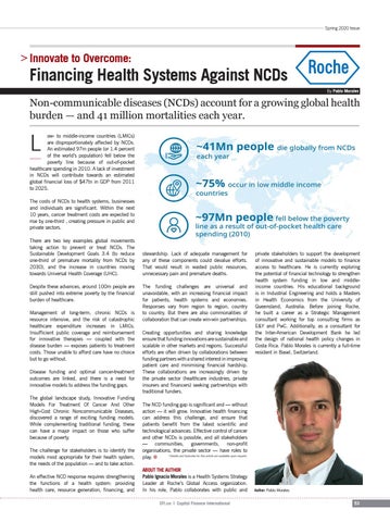 The NCD funding gap is significant and — without action — it will grow. Innovative health financing can address this challenge, and ensure that patients benefit from the latest scientific and technological advances. Effective control of cancer and other NCDs is possible, and all stakeholders — communities, governments, non-profit organisations, the private sector — have roles to *Details and footnotes for this article are available upon request. play. i ABOUT THE AUTHOR Pablo Ignacio Morales is a Health Systems Strategy Leader at Roche’s Global Access organization. In his role, Pablo collaborates with public and CFI.co | Capital Finance International