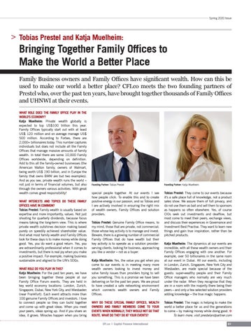 Bringing Together Family Offices to Make the World a Better Place Family Business owners and Family Offices have significant wealth. How can this be used to make our world a better place? CFI.co meets the two founding partners of Prestel who, over the past ten years, have brought together thousands of Family Offices and UHNWI at their events. WHAT ROLE DOES THE FAMILY OFFICE PLAY IN THE WORLD'S ECONOMY? Katja Muelheim: Private wealth globally is expected to top US$100 trillion this year. Family Offices typically start out with at least US$ 120 million and on average manage US$ 500 million. According to Forbes, there are 2,000+ billionaires today. This number captures individuals but does not include all the Family Offices that manage massive amounts of family wealth. In total there are some 10,000 Family Offices worldwide, depending on definition. Add to this all the family-owned businesses (the American Walton family, owners of Walmart, being worth US$ 190 billion, and in Europe the family that owns BMW are but two examples). And as you see, private wealth runs the world – not just in terms of financial volumes, but also through the owners various activities. With great wealth comes great responsibility! WHAT INTERESTS AND TOPICS DO THESE FAMILY OFFICES HAVE IN COMMON? Tobias Prestel: Family wealth is usually based on expertise and more importantly, values. Not just shooting for quarterly dividends, because focus means taking the long-term view. This is where private wealth outshines decision making based purely on speedily achieved shareholder value. And what most family wealth and Family Offices look for these days is to make money while doing good. Yes, you do want a good return. Yes, you are extraordinarily professional when it comes to investments, but there is real joy when you make a positive impact. For example, making business sustainable and aligned to the UN's SDGs. WHAT ROLE DO YOU PLAY IN THIS? Katja Muelheim: For the past ten years, we have been bringing together these people at our Family Office Forum events. They are held in key world economy locations: London, Zurich, Singapore, Dubai, New York City, and Wiesbaden (near Frankfurt). Each event attracts more than 100 genuine Family Offices and investors. I love to connect people so they can build together and come up with great ideas. When you meet your peers, ideas spring up. And if you share an idea, it grows. Miracles happen when you bring