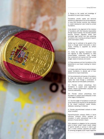 3. Relying on the capital and knowledge of foundations to boost impact investing Foundations provide capital and technical assistance to organisations and social enterprises. In many GSG member countries, key initiatives in market development were funded by private foundations. A key element is the alignment of the missions of foundations with their fiduciary responsibility through impact investing. This has been possible because domestic regulatory bodies have eliminated legal barriers that were preventing foundations from investing according to beyondprofit-maximisation criteria. Another way to contribute to the growth of the sector is through hybrid instruments in which impact investing is supported by venture philanthropy. 3.1 Clarify the regulatory framework (state and regional) to allow foundations to make mission-related investments, both through their endowment and reserves and their annual budget, based on revenues and income 3.2 Raise awareness and train foundations on the possibilities to use impact investing for mission fulfilment 3.3 Create a joint pilot financial vehicle between several foundations to allocate part of their endowment to impact investments 3.4 Use endowments and reserves of foundations to create new vehicles of patient and hybrid capital that invest through a combination of equity, debt and non-refundable contributions 3.5 Promote venture philanthropy from foundations to support social organizations towards internal transformation processes and financial sustainability 3.6 Promote venture philanthropy from foundations to support social enterprises in their initial stages of development 3.7 Use the budget of foundations to build part of the infrastructure required for the development of the impact investment market (studies, databases, spreading of initiatives). 4. Promote outcomes-based contracts to foster social innovation Payment-by-results contracts (PbRs) or Social Outcomes Contracts (SOCs) represent an innovation in public procurement and in the provision of social services in Spain. SOCs represent an obligation for the contracted party to deliver certain impact results instead of specific benefits or services in order to get paid. In these contracts, payments are subject to achieving pre-agreed social impact objectives 65