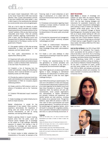 ABOUT THE AUTHORS Laura Blanco is director of knowledge and outreach for Spain NAB, the Spanish National Advisory Board for Impact Investment. Since 2017, she has been studying strategies and instruments for sustainable investments, with a focus on impact measurement methodologies while working as head of research for Nakatomi Capital’s private equity group. Prior to that, Blanco was an investment manager at Baring Asset Management. She started her career in New York as an equity analyst working for UBS and Credit Suisse, earning a spot in both Institutional Investor and Latin Finance Research Olympics. In 2006, she moved to Hong Kong as a principal of fintech start-up Lusight Research to open the Asian market. She holds an MBA from NYU Stern School of Business. José Luis Ruiz de Munain is the CEO of Spain NAB and founder of its Secretariat, Foro Impacto, which successfully led the process of Spain's entry to the GSG in June 2019. He is a founding trustee of UnLtd Spain, a social entrepreneurship accelerator, and Senior Advisor of the International Venture Philanthropy Center (IVPC), a center of international excellence aiming at creating a Latin American Network of Venture Philanthropy. He has been a consultant for public, private and third sector entities, such as the IDB Lab, PwC, CECA or BBVA, and professor and lecturer in several business schools and universities. He holds a bachelor in Economics and an MBA from IE Business School.