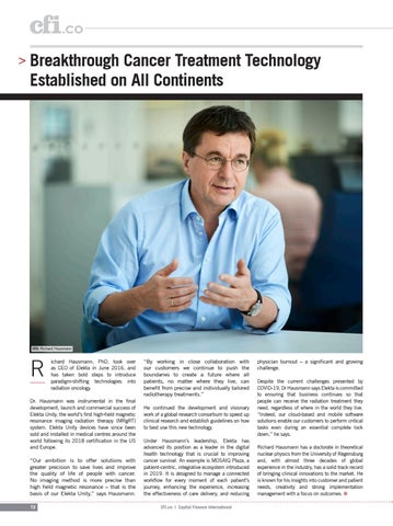 “By working in close collaboration with our customers we continue to push the boundaries to create a future where all patients, no matter where they live, can benefit from precise and individually tailored radiotherapy treatments.” He continued the development and visionary work of a global research consortium to speed up clinical research and establish guidelines on how to best use this new technology. Under Hausmann’s leadership, Elekta has advanced its position as a leader in the digital health technology that is crucial to improving cancer survival. An example is MOSAIQ Plaza, a patient-centric, integrative ecosystem introduced in 2019. It is designed to manage a connected workflow for every moment of each patient’s journey, enhancing the experience, increasing the effectiveness of care delivery, and reducing CFI.co | Capital Finance International