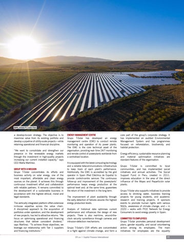 core part of the group’s corporate strategy. It has implemented an audited Environmental Management System and has programmes focused on reforestation, biodiversity and habitat protection. Energy efficiency, sustainable resource planning and material optimisation initiatives are standard features of the organisation. Grupo T-Solar is committed to local communities, and has implemented social initiatives and annual activities. The Social Support Fund in Peru, created in 2011, improves education in the area of the direct influence of the Majes and Repartición solar plants. Grupo T-Solar also supports initiatives to provide access to drinking water, business training projects for young students, and academic research and training projects. It sponsors events to promote human rights with various NGOs, awareness of climate change, and – in 2020 – works with PICE Network for Energy Consumers to avoid energy poverty in Spain. COMMITTED TO EMPLOYEES Grupo T-Solar promotes personal development plans, gender equality, and social volunteering action among its employees. The main initiatives for employees are the equality 77