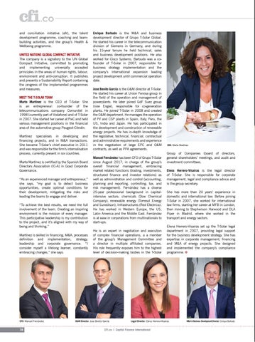 and conciliation initiative (efr), the talent development programme, coaching and teambuilding activities, and the group’s Health & Wellbeing programme. UNITED NATIONS GLOBAL COMPACT INITIATIVE The company is a signatory to the UN Global Compact Initiative, committed to promoting and implementing universally accepted principles in the areas of human rights, labour, environment and anti-corruption. It publishes and presents a Sustainability Report containing the progress of the implemented programmes and measures. MEET THE T-SOLAR TEAM Marta Martínez is the CEO of T-Solar. She is an entrepreneur: co-founder of the telecommunications company Comunitel in 1998 (currently part of Vodafone) and of T-Solar in 2007. She started her career at PwC and held various management positions in the financial area of the automotive group Peugeot-Citroën. Martínez specialises in developing and financing projects, and in M&A transactions. She became T-Solar’s chief executive in 2011 and was responsible for the firm’s internalisation process, currently present in six countries. Marta Martínez is certified by the Spanish Board Directors Association (IC-A) in Good Corporate Governance. “As an experienced manager and entrepreneur,” she says, “my goal is to detect business opportunities, create optimal conditions for their development, mitigating the risks and leading the teams to engage and deliver. “To achieve the best results, we need the full involvement of the team. Creating an inspiring environment is the mission of every manager. This participative leadership is my contribution to the project, and it’s aligned with my way of being and thinking.” Martínez is skilled in financing, M&A, processes definition and implementation, strategy, leadership and corporate governance. “I consider myself a lifelong learner, constantly embracing changes,” she says.