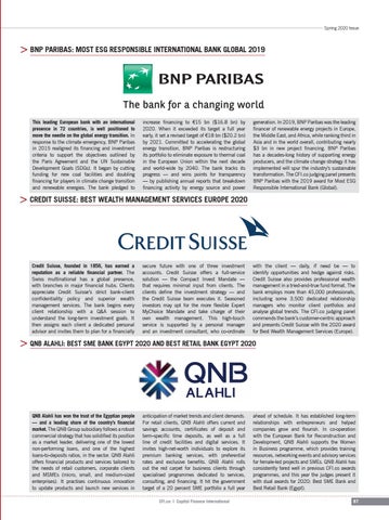 generation. In 2019, BNP Paribas was the leading financer of renewable energy projects in Europe, the Middle East, and Africa, while ranking third in Asia and in the world overall, contributing nearly $3 bn in new project financing. BNP Paribas has a decades-long history of supporting energy producers, and the climate change strategy it has implemented will spur the industry’s sustainable transformation. The CFI.co judging panel presents BNP Paribas with the 2019 award for Most ESG Responsible International Bank (Global).