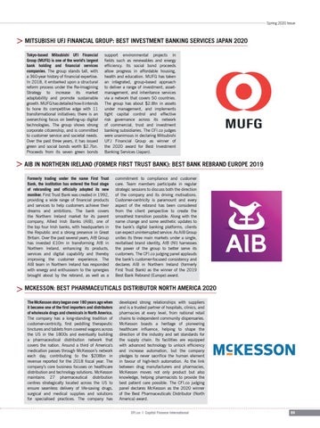 support environmental projects in fields such as renewables and energy efficiency. Its social bond proceeds allow progress in affordable housing, health and education. MUFG has taken an integrated, group-based approach to deliver a range of investment, assetmanagement, and inheritance services via a network that covers 50 countries. The group has about $2.8tn in assets under management, and implements tight capital control and effective risk governance across its network of commercial, trust and investment banking subsidiaries. The CFI.co judges were unanimous in declaring Mitsubishi UFJ Financial Group as winner of the 2020 award for Best Investment Banking Services (Japan).