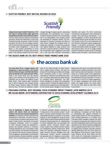 fiduciary’s playbook, whether it’s looking after the wellbeing of employees and their families or collaborating with regional authorities to create support systems for the local population. Good corporate governance is a constant, and Fiduciaria Central manages to balance the need for corporate transparency with respect for client and staff confidentiality. Marín and his team were rewarded for their efficient portfolio management with an upgraded rating of AAA in 2019. The CFI. co judging panel recognises Fiduciaria Central’s sterling performance with the 2019 award for Best Regional Socio-Economic Impact Finance (Latin America) and Mr Oscar Marín with the 2019 award for Outstanding Contribution to Socio-Economic Development (Colombia).