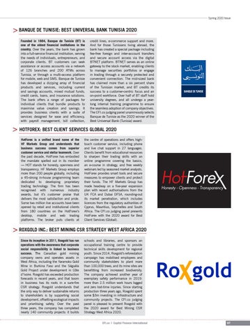credit lines, e-commerce support and more. And for those Tunisians living abroad, the bank has created a special package including fee-free foreign and inter-account transfers and secure account access via the digital BTNET platform. BTNET serves as an online gateway to the stock market, enabling clients to manage securities portfolios or engage in trading through a securely protected and convenient connection. The mid-sized bank has claimed more than a six percent share of the Tunisian market, and BT credits its success to a customer-centric focus and an on-point workforce. Over half of BT staff hold university degrees, and all undergo a yearlong internal training programme to ensure the seamless adoption of company objectives. The CFI.co judging panel unanimously selects Banque de Tunisie as the 2020 winner of the Best Universal Bank (Tunisia) award.