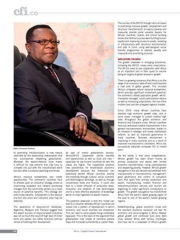 The success of the BRICS (though not in all cases) in promoting inclusive growth, employment and structural transformation to reduce poverty and inequality provide some valuable lessons for African countries. Overall, the critical building blocks that defined success were building human capital and improving access to assets; investing in infrastructure with structural transformation and jobs in mind; using well-designed social transfer programmes to address poverty and inequality and prioritizing inclusion. IMPLICATIONS FOR BRICS The growth slowdown in emerging economies, including the BRICS, raises some implications. The BRICS need to see cooperation with Africa as an important tool in their quest to resume being an engine of global economic growth. There is a growing consensus that Africa is on the verge of an economic take-off and could become a new pole of global growth. This includes Africa’s untapped natural resource endowment, which provides significant investment potential; the continent’s steady population growth, which, if properly managed, could yield positive returns as well as increasing urbanization, the rise of the middle class and the untapped regional market. Since 2003, many African countries have attained high economic growth rates, and in some cases, managed to sustain relative high rates throughout the global economic and financial and Eurozone crises. African countries have also witnessed notable improvements in the general macroeconomic environment, thanks to an increase in strategic and timely institutional reforms, as well as improved governance in many countries. Business environment is improving in many countries and as a result of improved macroeconomic conditions, Africa has successfully attracted increased FDI in recent years.