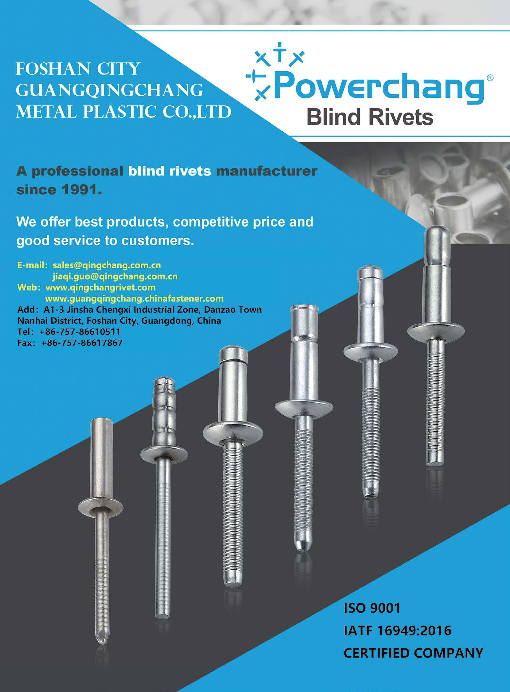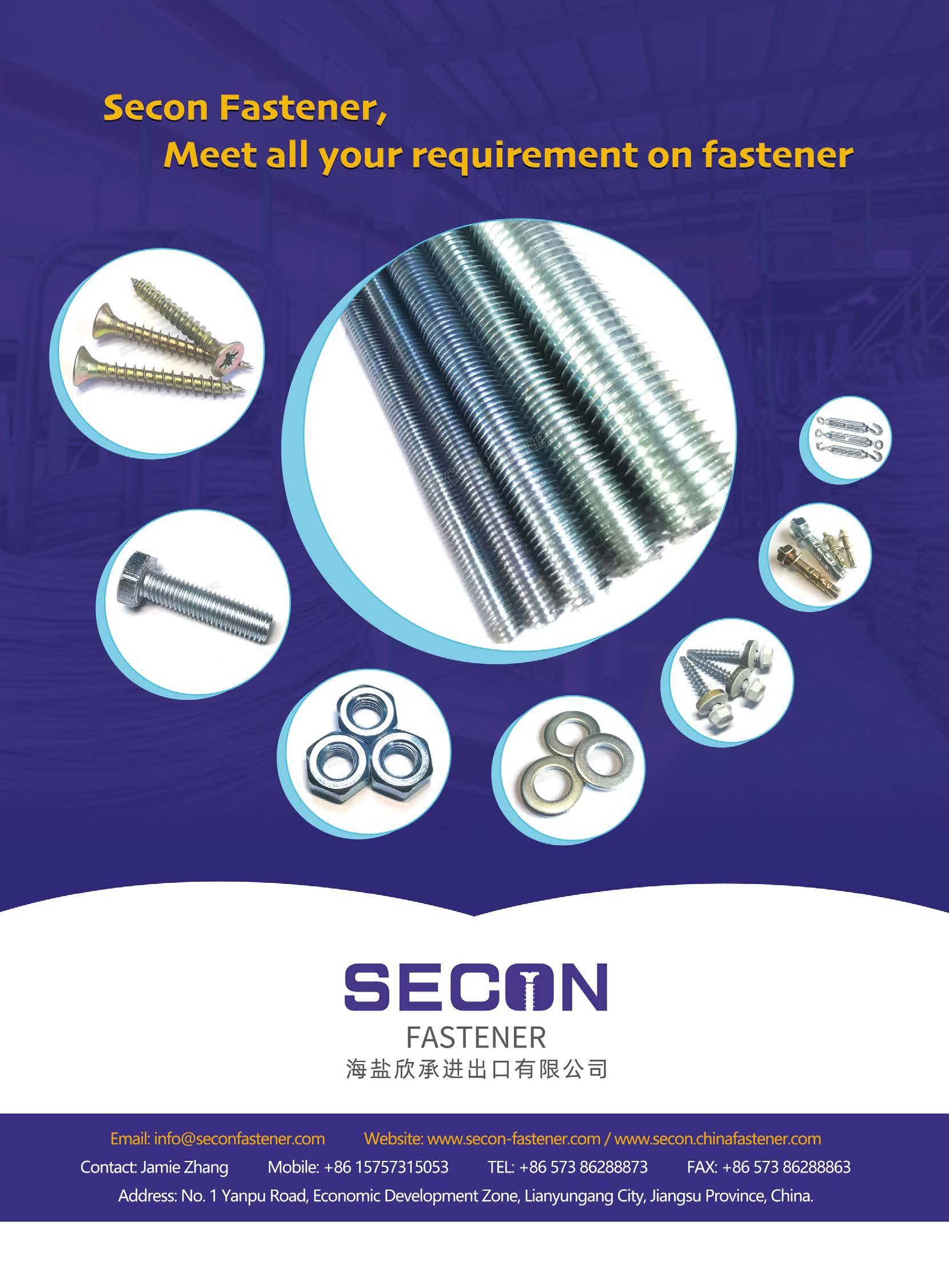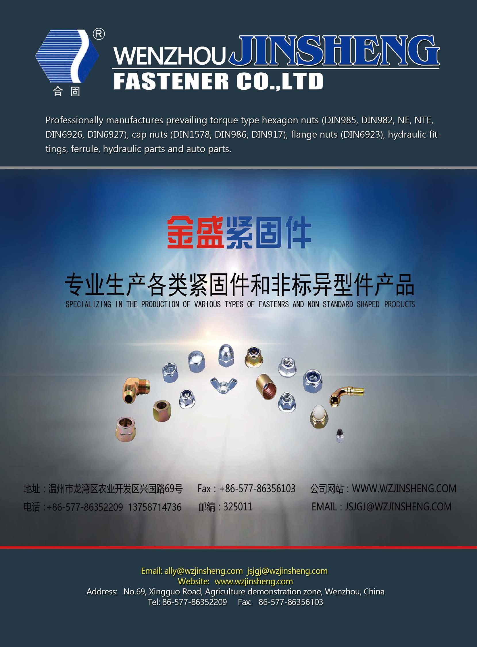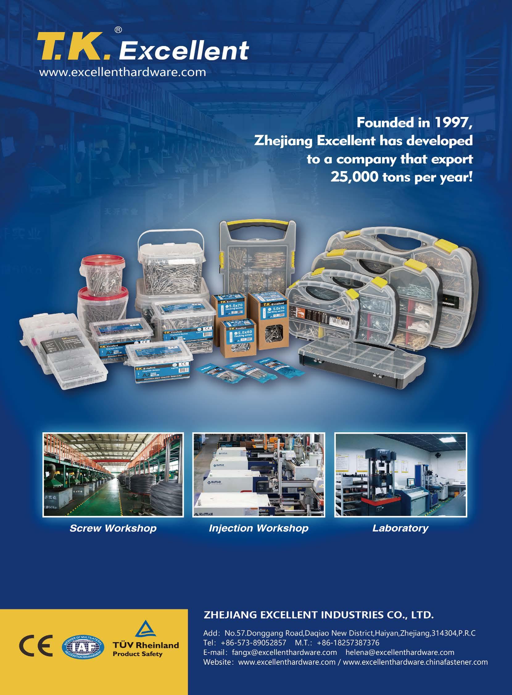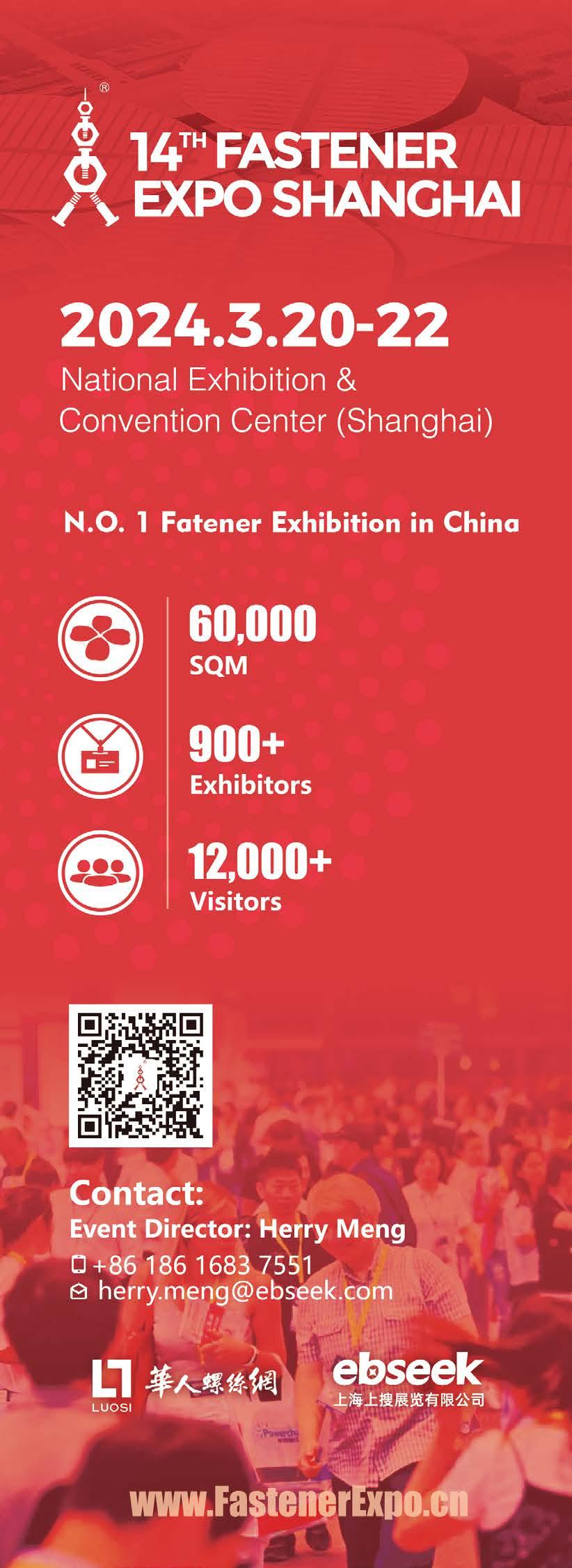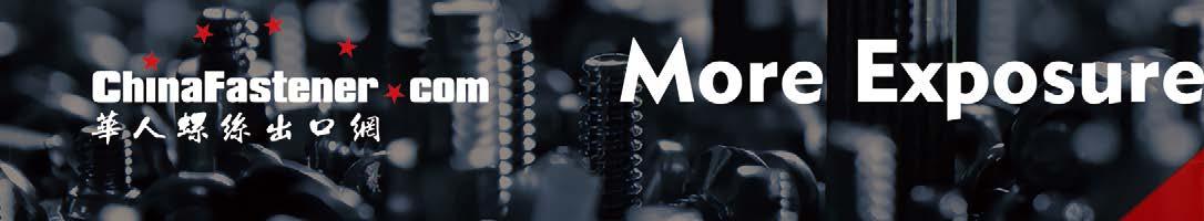 Chairman Yang Junfeng / yangjf@luosi.com Deputy Editor Gracie Wang / gracie.wang@chinafastener.com Content Editor Fang Jiaquan / fangjq@luosi.com Copy Editor Hailey Ruan / hailey.ruan@chinafastener.com Graphic Design Wu Likui / wulk@luosi.com Disclaimer The Publisher cannot be held responsible or liable for errors or omissions, during input or printing of any materials supplied or contained herein. The Publisher also cannot be held liable for any claims made by advertisers. The opinions expressed are not necessarily those of the Editor or the Publisher. The advertisers should be responsible for authorization of copyright of any materials provided. Copyright All rights reserved. No part of this publication may be reproduced or transmitted in any form or by any means without the prior permission of the publisher. Annual subscription (4 issues) to non-trade and outside China is USD99.00. Download or subscribe e-Magazine www.chinafastener.com Part of China Fastener Group Limited Ad Please contact 86-20-82270680 广告刊登请联系editor@chinafastener.com