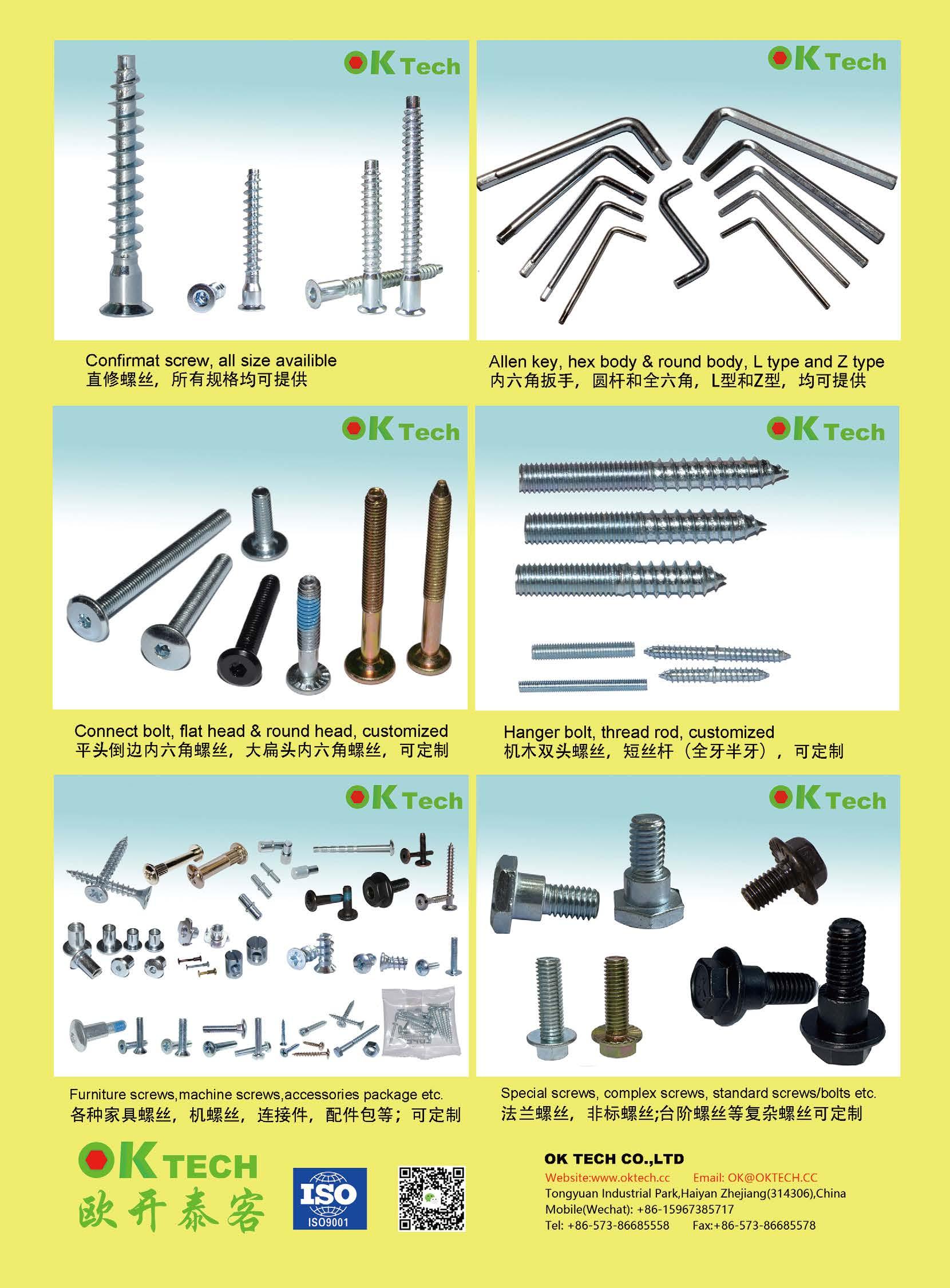 OK TECH CO.,LTD located in Haiyan Zhejiang province, established in 2019. Our company is professional manufacturer for hand tools,furniture fittings,auto parts,allen keys, screws, nuts, shelf support, special parts, bolts. Furniture screws, furniture nuts and connecting fittings, confirmat screws, connector bolts, hex bolts, hex socket furniture screws, hex socket machine screws… etc.