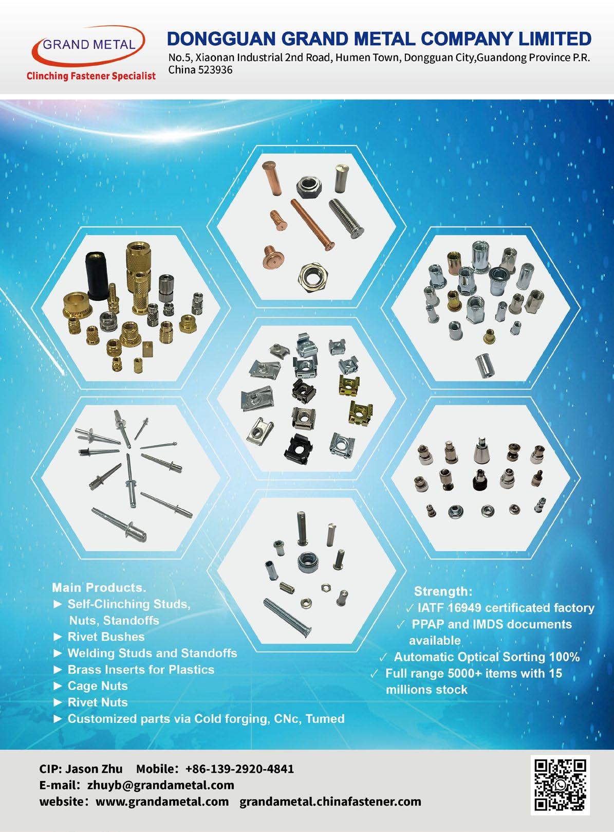 Grand Metal produces self-clinch nuts, standoff, studs equivalent to PEM standard, rivet nuts, weld studs, cage nuts, brass inserts and customized parts for CNC and cold forging, 200 millions stock, 5000+ items, PPAP and IMDS for automotive industry, IATF 16949 certificated . Most quotation can be obtained within 24-48 hours, with samples usually available within one week.