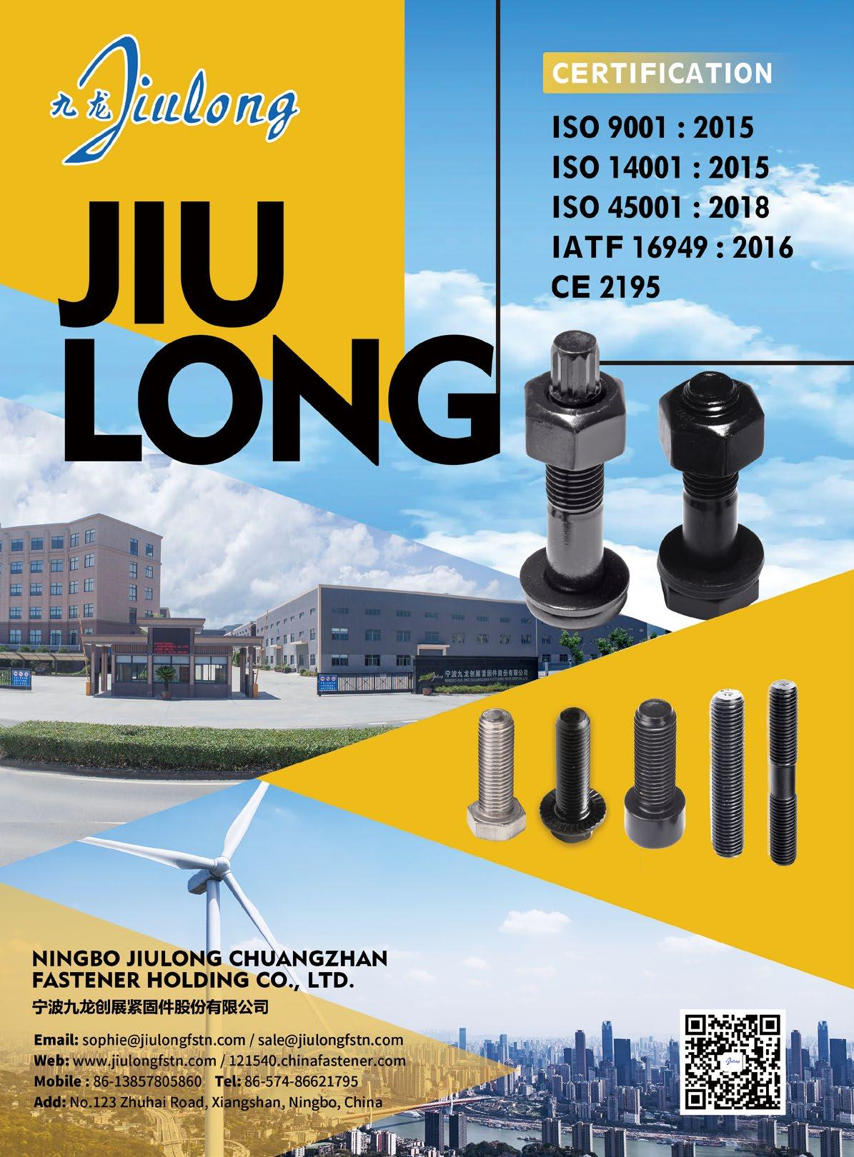 Ningbo Jiulong Chuangzhan Fastener Holding Co., Ltd. is an enterprise specializing in the production, research & development, sales, and technical service of high-strength fasteners. The products, including hexagon bolts, socket head screws, studs, hexagon nuts, welding studs, other high-strength fasteners, and non-standard fasteners made according to the drawings, are widely applicable in metallurgy, power, petrochemical industries, large span steel structure factories, high-rise buildings, wind power generation, railway bridges, cross-sea bridges, subways, oil refineries, etc. The company has passed the ISO9001:2015 Quality Management System, IATF 16949:2016, ISO14001:2015, and ISO45001:2018 certifications. All products adhere to the standards of GB, ISO, EN, DIN, ASME, JIS, BS, and other international standards.